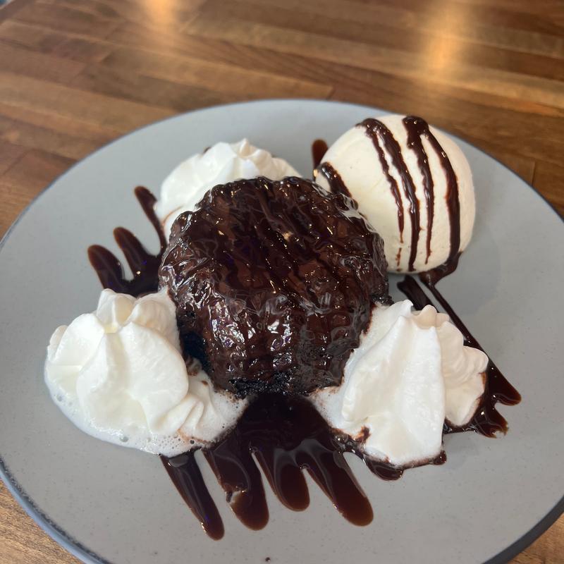 Moist chocolate cake with a wickedly warm center of molten chocolate & a side of vanilla ice cream
